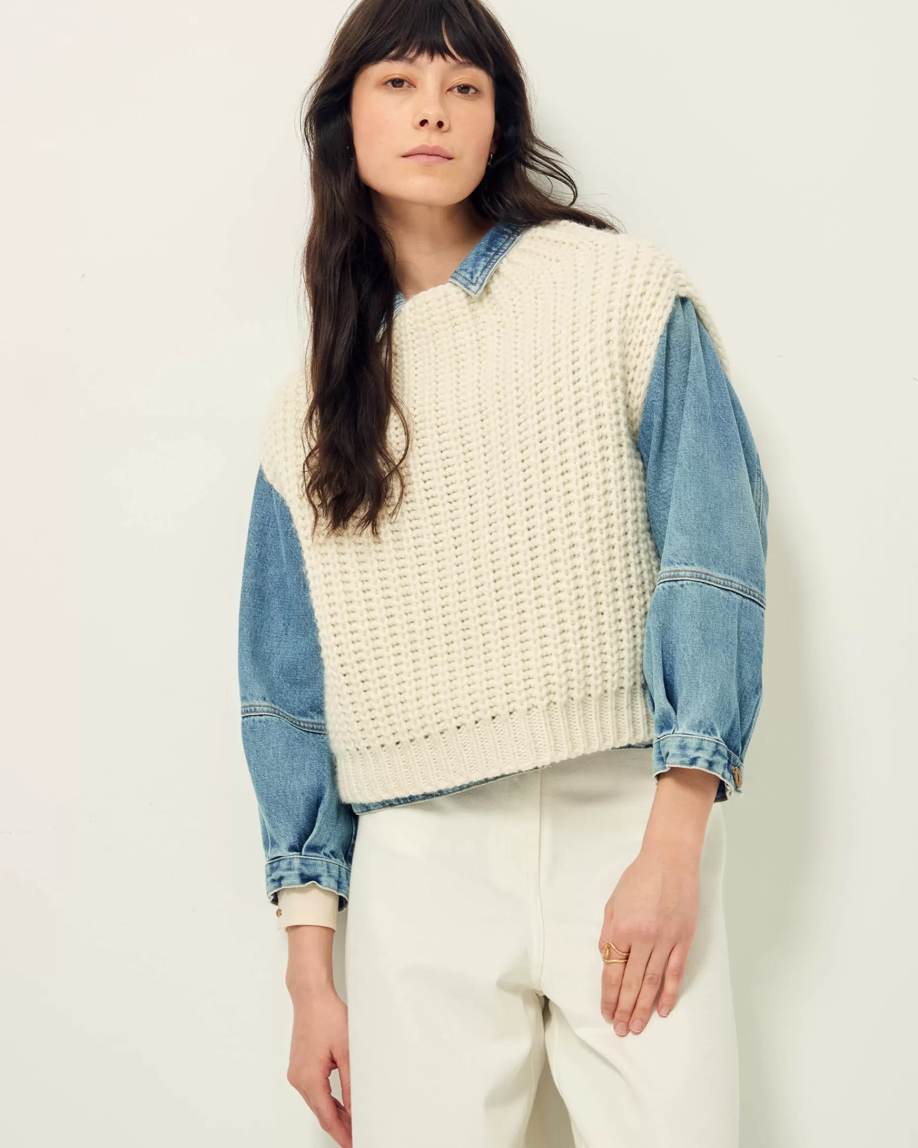 Pull ample sans manches en côtes perlées grosse jauge tricoté en Italie.