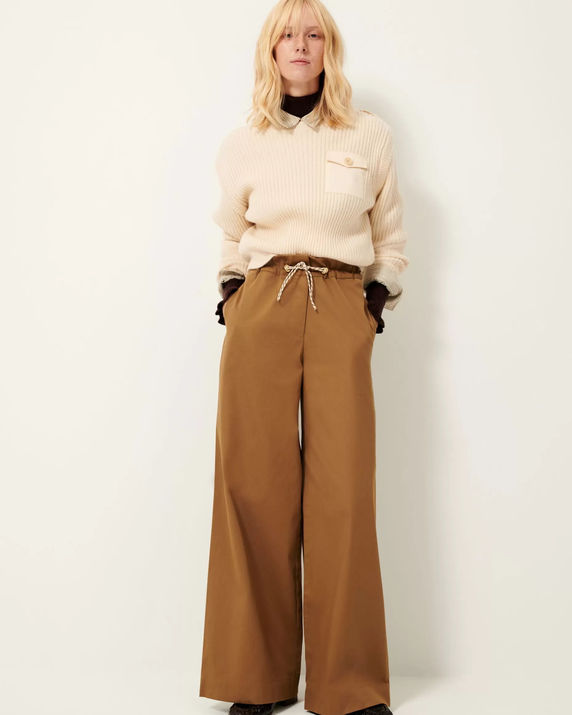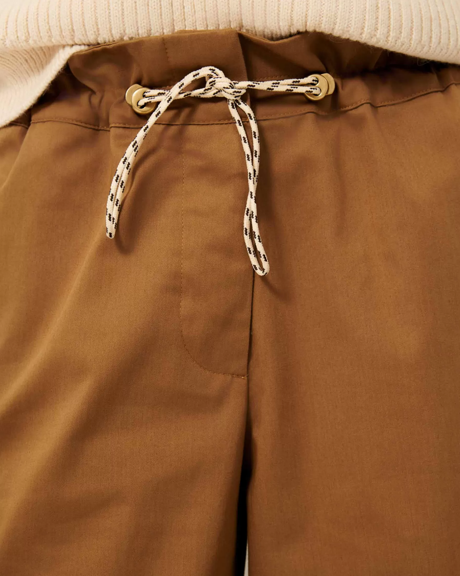 Pantalon ample ajustable à la taille par un lien fantaisie en satin effet gabardine, apprêté en France.