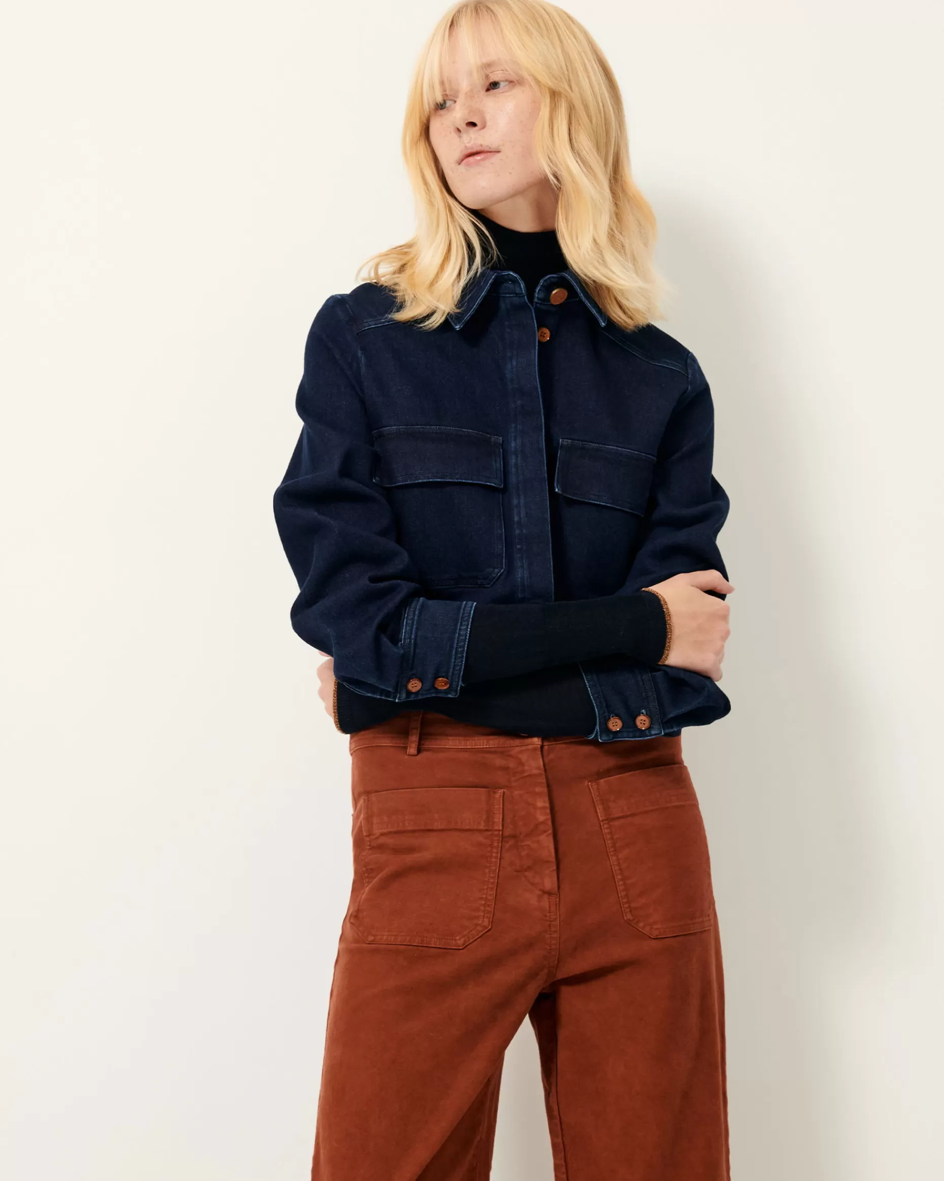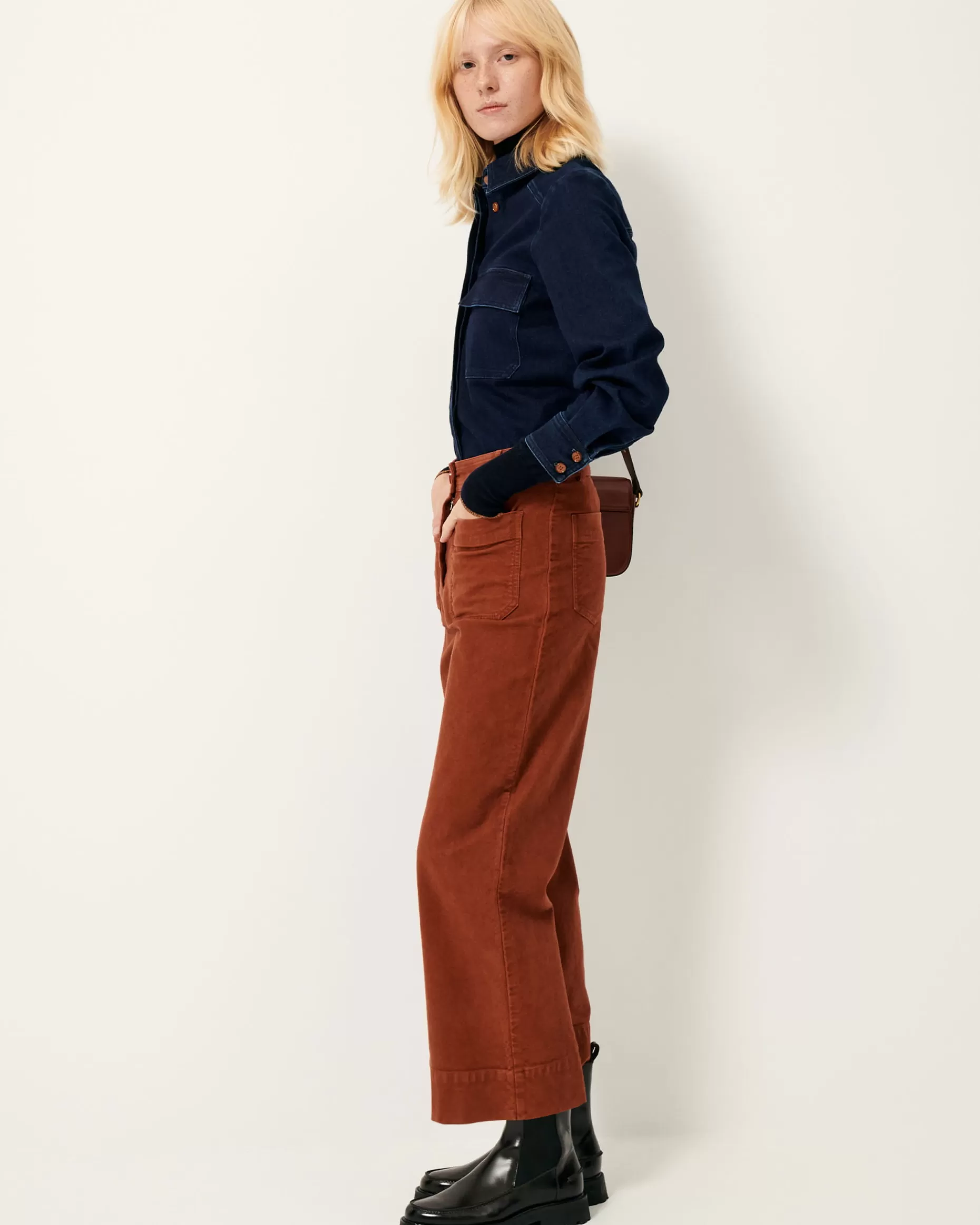 Pantalon en A en gabardine façon suédine, finition velvet, teinte en plongée, tissé en Espagne.