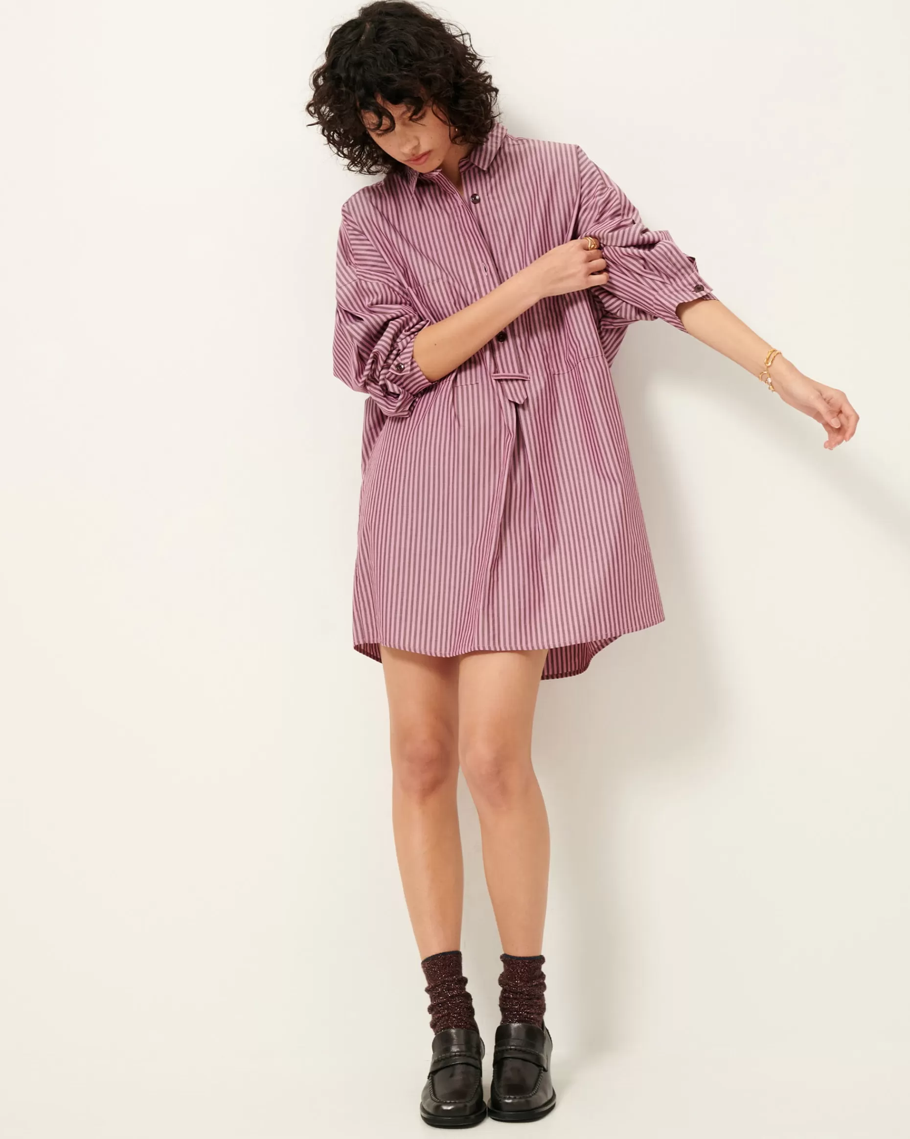 Robe chemise esprit liquette à poches plaquées en popeline compacte de coton à rayures bicolores tissée en Italie, exclusif Sessùn.